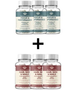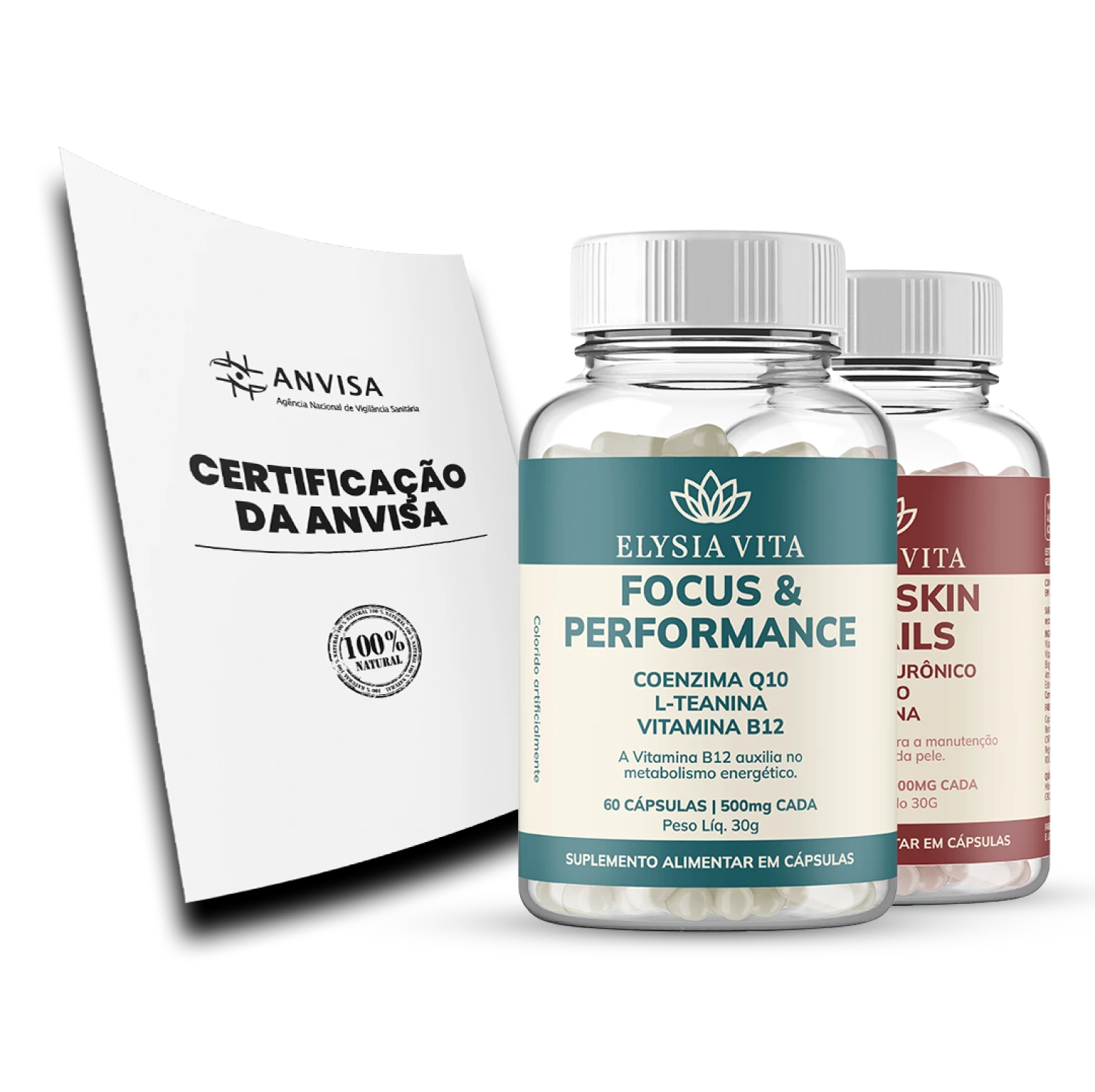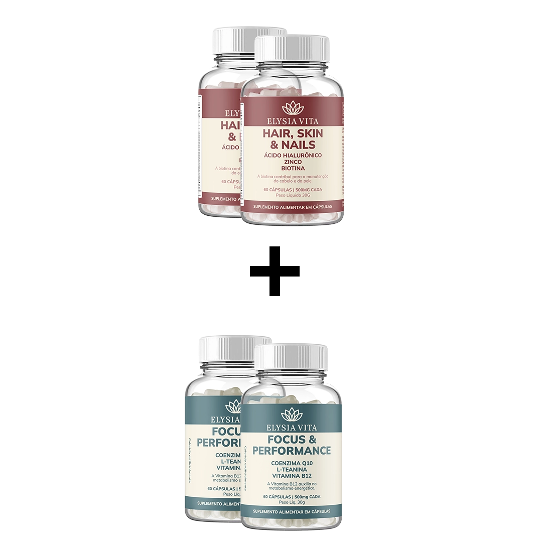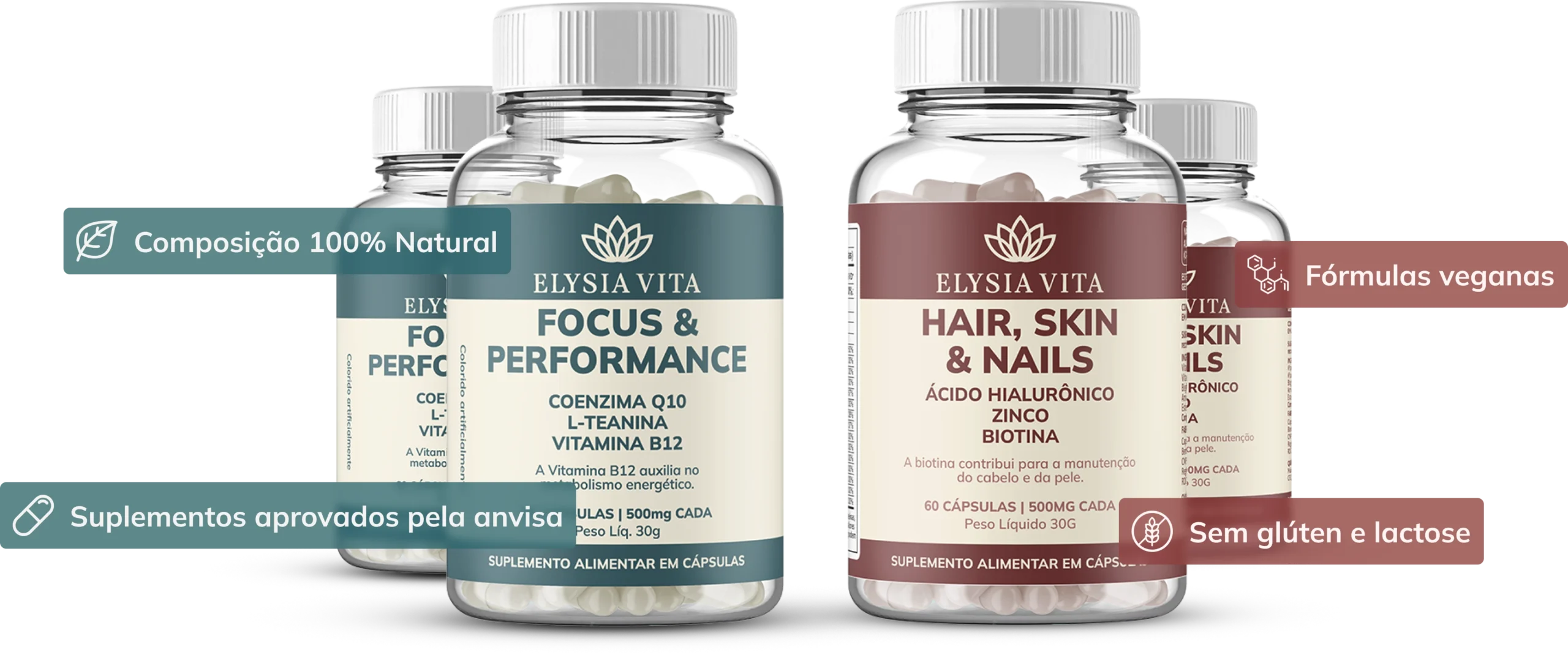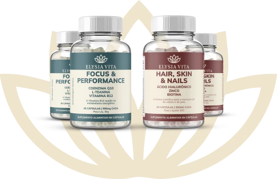 A Linha Elysia Vita une nutrição funcional para corpo e mente. Hair, Skin & Nails e Focus & Performance atuam juntos, combinando beleza e desempenho.